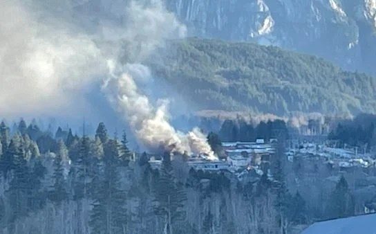 Flames could be seen shooting out of the building on Tantalus Road between Garibaldi Way and Diamond Road. A fire broke out Monday afternoon in a building that houses a popular restaurant in Squamish according to witnesses.